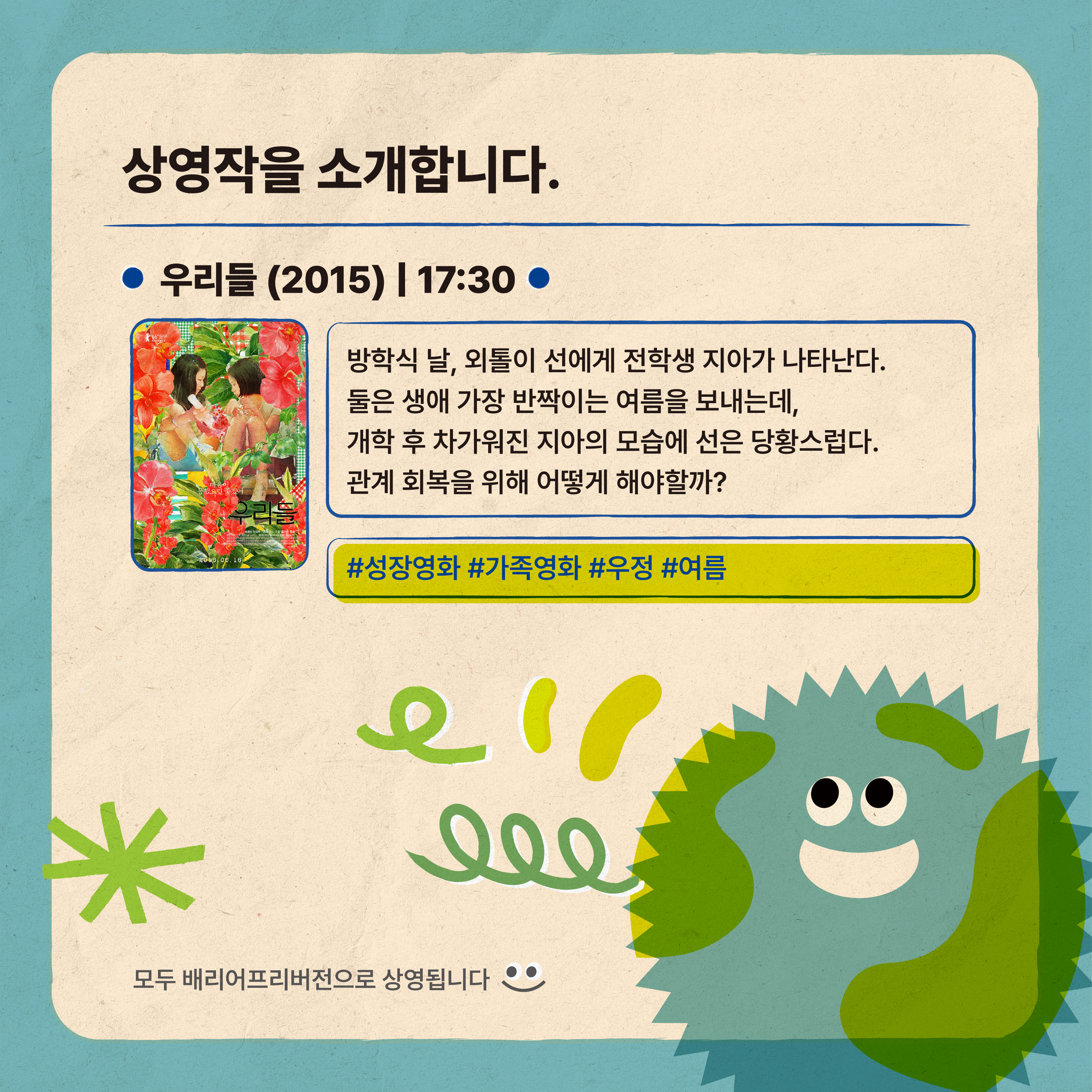 À̹ø »ó¿µÈ¸¸¦ ÅëÇØ ¹è¸®¾îÇÁ¸®¿µÈ­¸¦ Á÷Á¢ °æÇèÇØº¸°í ±× Çʿ伺¿¡ ´ëÇØ ´Ù°°ÀÌ »ý°¢Çغ¾½Ã´Ù!