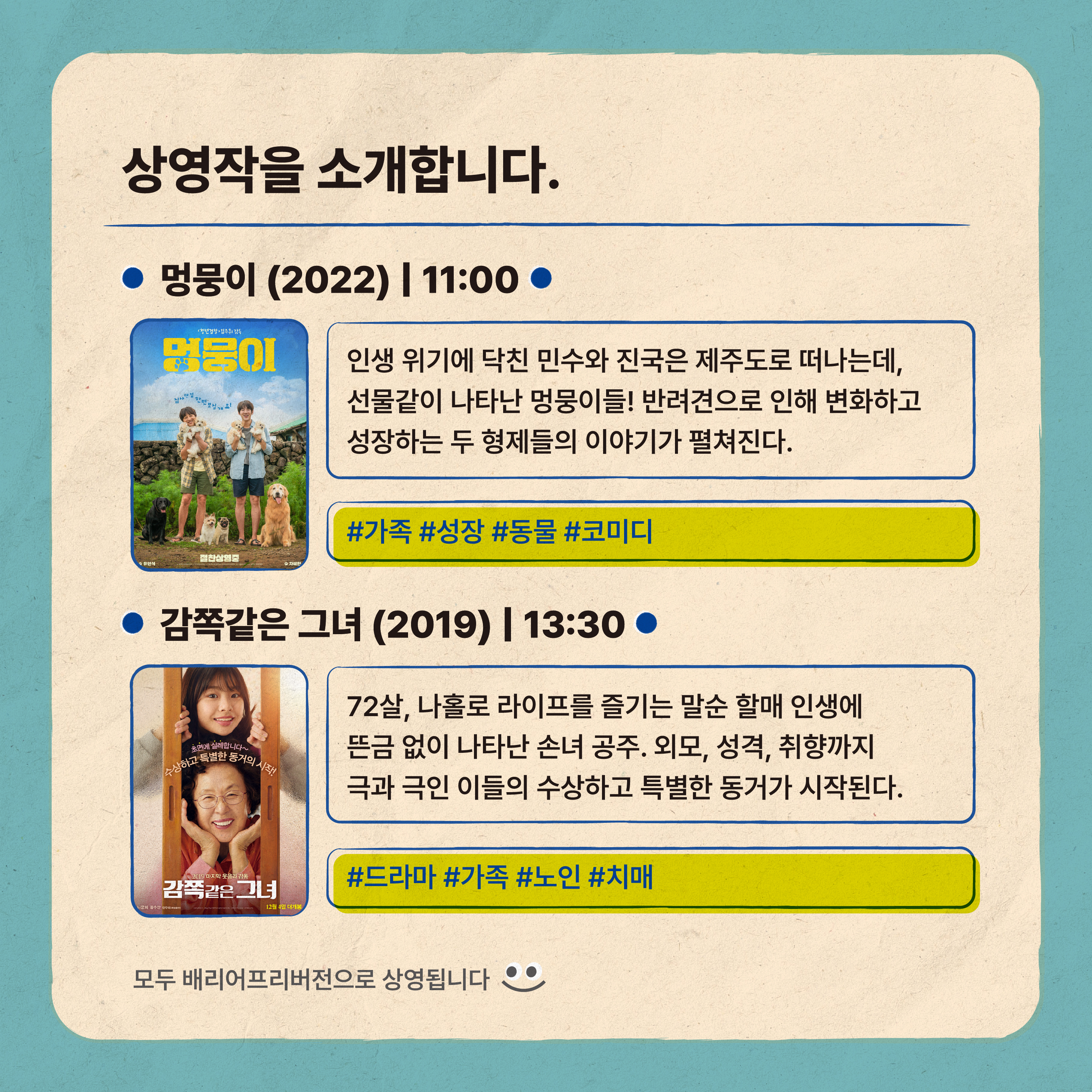¹è¸®¾îÇÁ¸®¿µÈ­´Â ±âÁ¸ ¿µÈ­¿¡ È­¸éÀ» ¼³¸íÇØÁÖ´Â À½¼ºÇؼ³°ú È­ÀÚ ¹× ´ë»ç, À½¾Ç, ¼Ò¸®Á¤º¸¸¦ ¾Ë·ÁÁÖ´Â